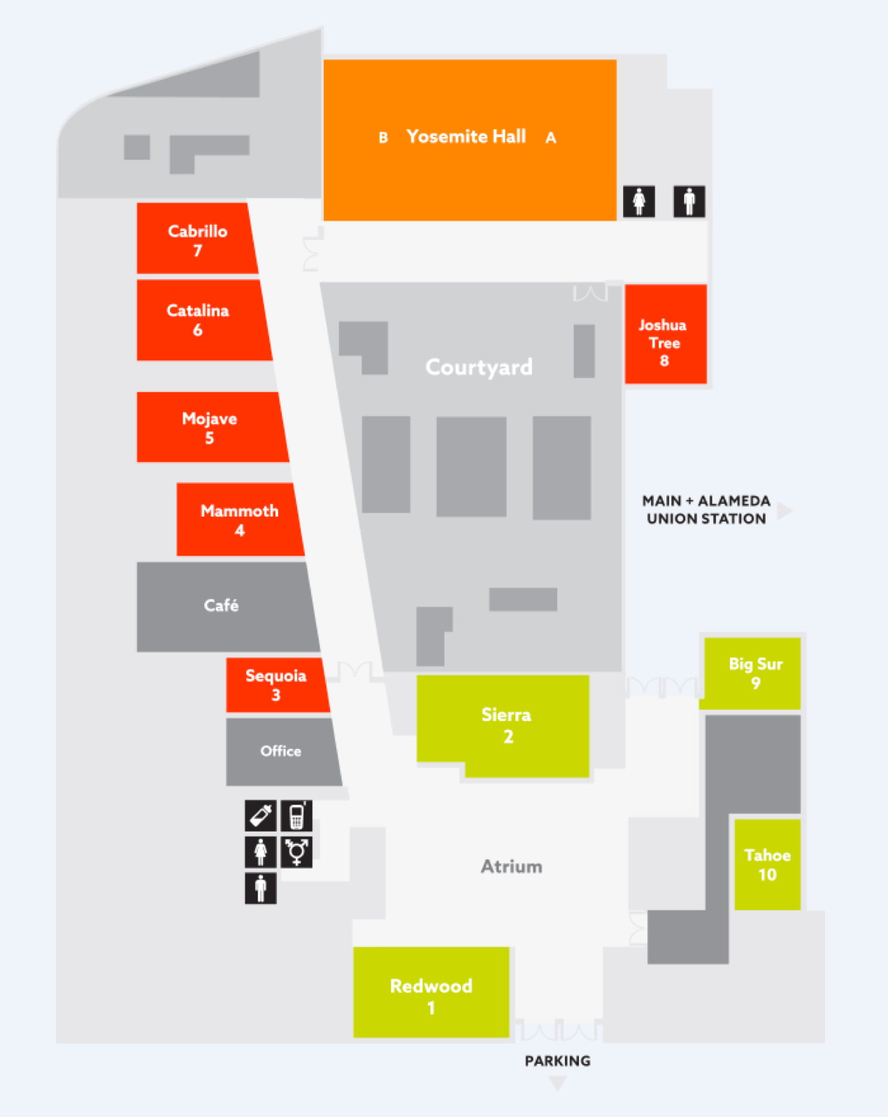 Click on the floor plan to see a description of each room, including photos, diagrams, and available resources. Conference Center staff can assist in identifying the best room for your event.